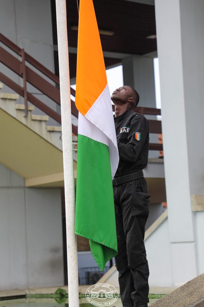 Moment solennel de la cérémonie, le salut au drapeau national s’est voulu, cette fois encore, un temps fort de rappel aux valeurs républicaines et civiques. À cette occasion, le président de l’UFHB, le Prof. BALLO Zié, a exhorté les enseignants-chercheurs, personnels administratifs et techniques, ainsi que les étudiants à un strict respect du règlement intérieur et des principes qui fondent la vie en collectivité.