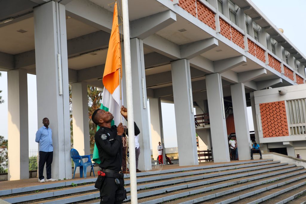 Réunis, ce lundi 3 février 2025, sur l’esplanade de la présidence de l’Université Félix Houphouët-Boigny (UFHB), autour du Prof. Vincent MONSAN, Vice-président en charge de la Pédagogie et de la Vie universitaire, enseignants-chercheurs, chercheurs, personnel administratif et technique et étudiants ont procédé à la montée du drapeau sous les airs de l’hymne national.